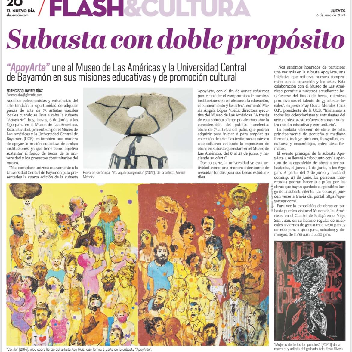 El viernes, 7 de junio de 2024 la Universidad Central de Bayamón (UCB) y el Museo De Las Américas celebraron una velada extraordinaria dedicada a las artes y la música, con el objetivo de sustentar el fondo de becas de la UCB y respaldar el Programa de Exhibiciones del museo. La iniciativa reunió a numerosos artistas, coleccionistas y entusiastas del arte, quienes se unieron para apoyar estas nobles causas.